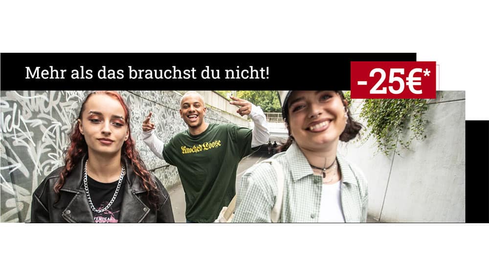 Bei EMP bekommt man zurzeit 25€ Rabatt auf Bekleidung & Accessoires ab einem Mindestbestellwert von 100€, darunter Artikel wie Shirts, Hoodies, Caps, Hosen und mehr.