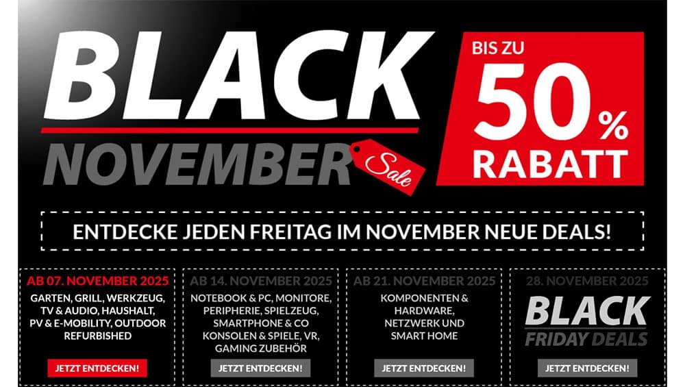Alternate startet heute den Black November Sale 2025 und bietet bis zum 01.12.2025 um 23:59 Uhr jeden Freitag im November neue, ausgewählte Produkte mit Rabatten an. Jede Woche kommen weitere Bereiche dazu, jeweils nur für kurze Zeit und nur solange der Vorrat reicht.