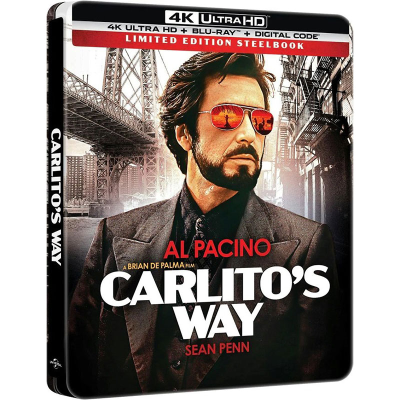 Universal Pictures Home Entertainment veröffentlicht in den USA im April 2026 den Thriller „Carlito’s Way“, mit Al Pacino, Sean Penn, Penelope Ann Miller, John Leguizamo, Viggo Mortensen, James Rebhorn, Luis Guzman, im Steelbook mit 4K UHD und Blu-ray. Bisher gilt die Ankündigung im Ausland.