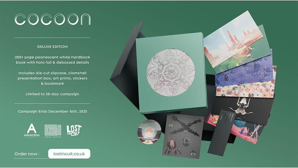 Lost In Cult bringt im 4. Quartal 2026 das Buch „Cocoon: Design Works“ in Zusammenarbeit mit Geometric Interactive und Annapurna Interactive in einer Deluxe Edition und als Standard Variante in englischer Sprache heraus. Das Werk bietet einen tiefen Einblick in die Entstehung des preisgekrönten Indie-Spiels Cocoon und beleuchtet dessen Entwicklung von einer abstrakten Idee bis zum fertigen Puzzle-Abenteuer. Verfasst wurde das Buch von Spielejournalistin Rachel Watts, die für das Projekt ausführliche Interviews mit den Entwicklern Jeppe Carlsen, Jakob Schmid und Erwin Kho führte.