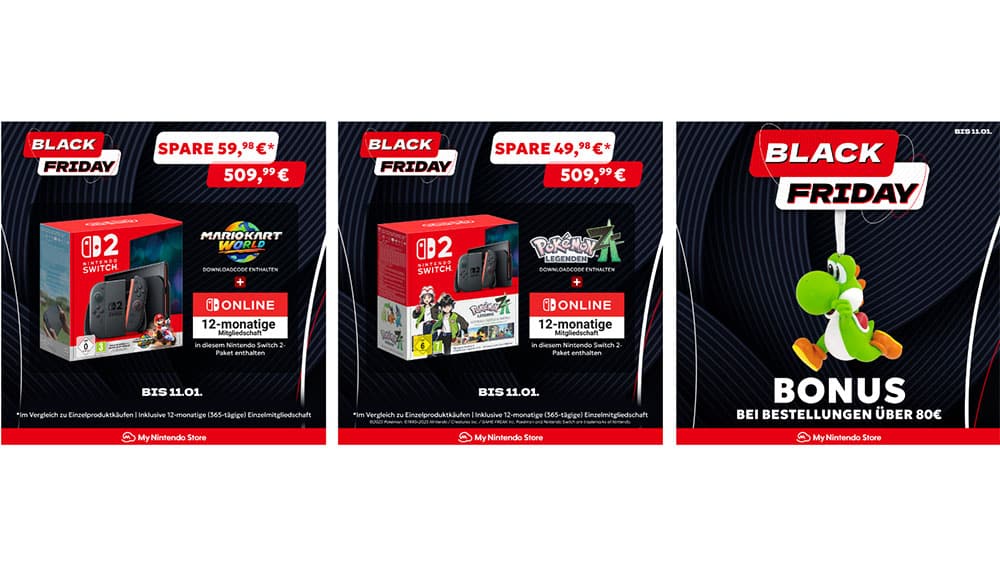 Ab einem Bestellwert von 80€ wird außerdem ein Yoshi-Baumschmuck kostenlos beigelegt. Zwischen dem 17. und 30. November 2025 laufen zusätzlich digitale Deals, darunter The Legend of Zelda: Echoes of Wisdom und die Erweiterung Animal Crossing: New Horizons – Happy Home Paradise.