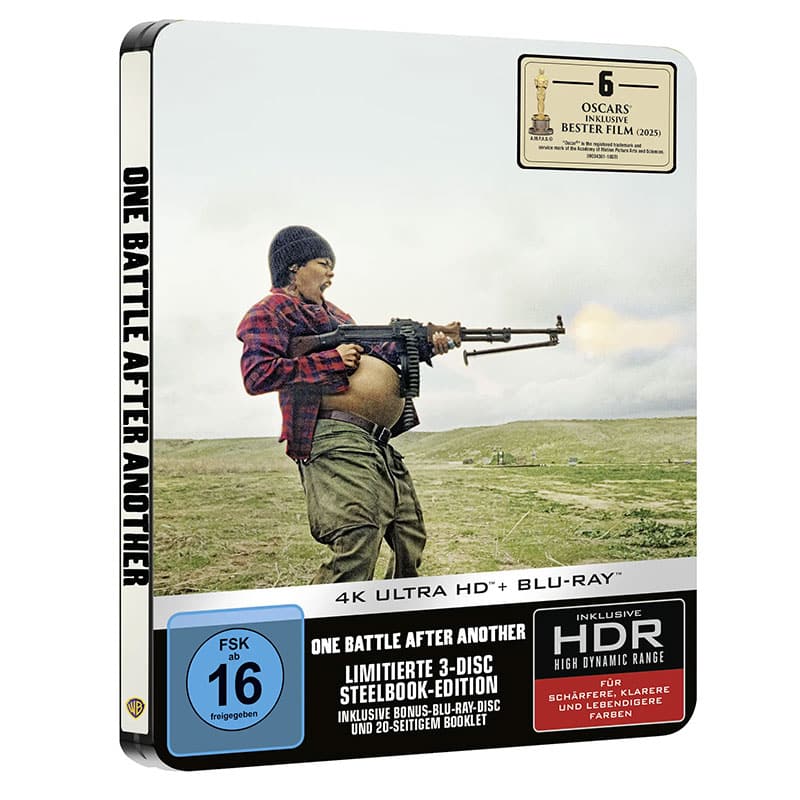 Warner Home Video bringt im ersten Quartal 2026 den Action-Krimi-Thriller „One Battle After Another“ (2025), mit Leonardo DiCaprio, Sean Penn, Chase Infiniti, Benicio del Toro und Regina Hall, in den Standard Varianten auf 4K UHD, Blu-ray und DVD, sowie im Steelbook mit 4K UHD (HDR), Blu-ray, Bonus Disc und 24-seitigem Booklet.