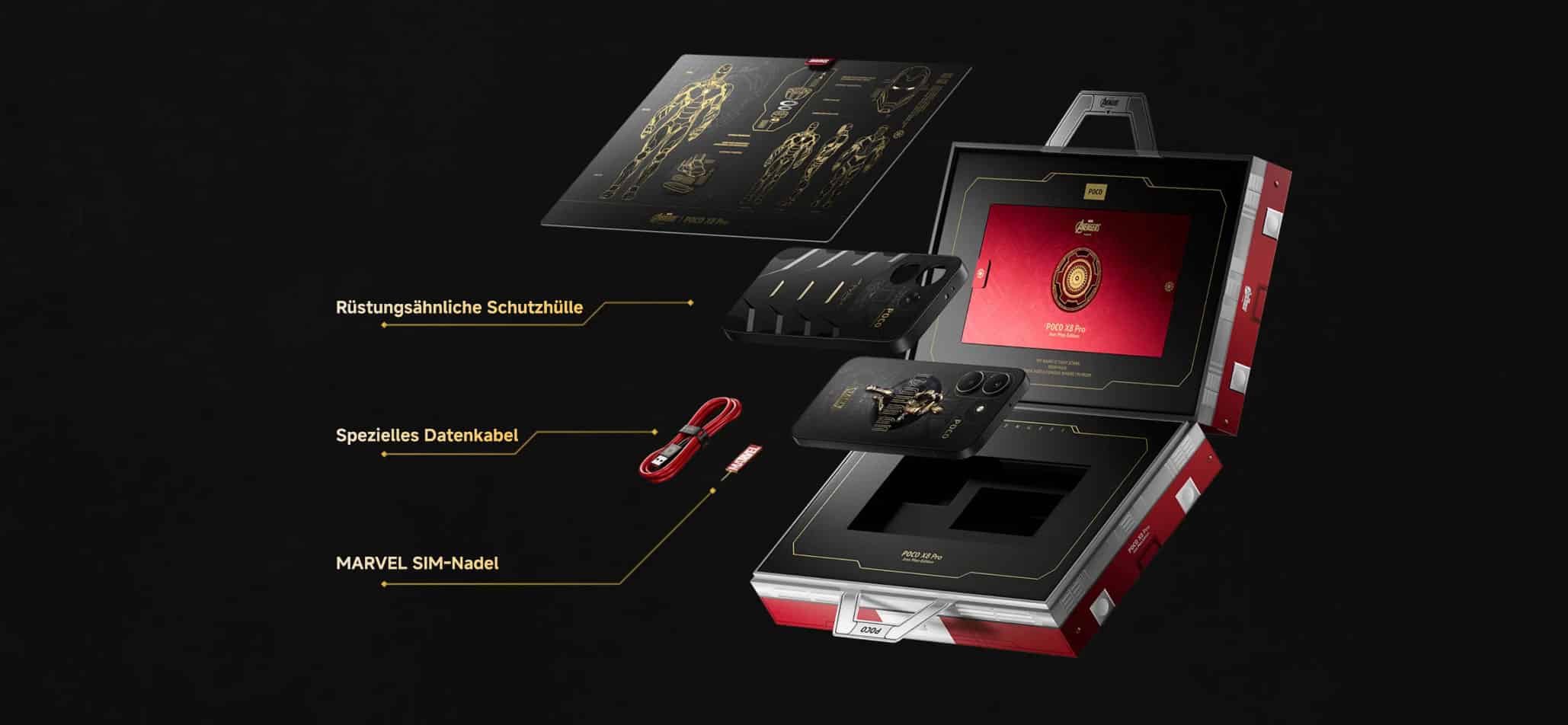 POCO bringt das X8 Pro als Iron Man Edition auf den Markt. Die Iron Man Edition hebt sich durch ein schwarzes Gehäuse mit goldenen Akzenten ab, wobei ein Arc-Reaktor-Element auf der Rückseite integriert ist. Ergänzt wird das Design durch ein individuell angepasstes Systemdesign sowie eine passende Schutzhülle im Stil des MK5-Anzugs. Technisch entspricht die Sonderedition dem regulären Modell.
