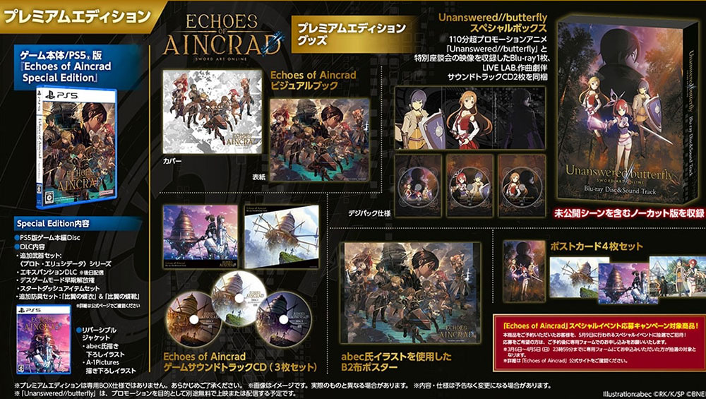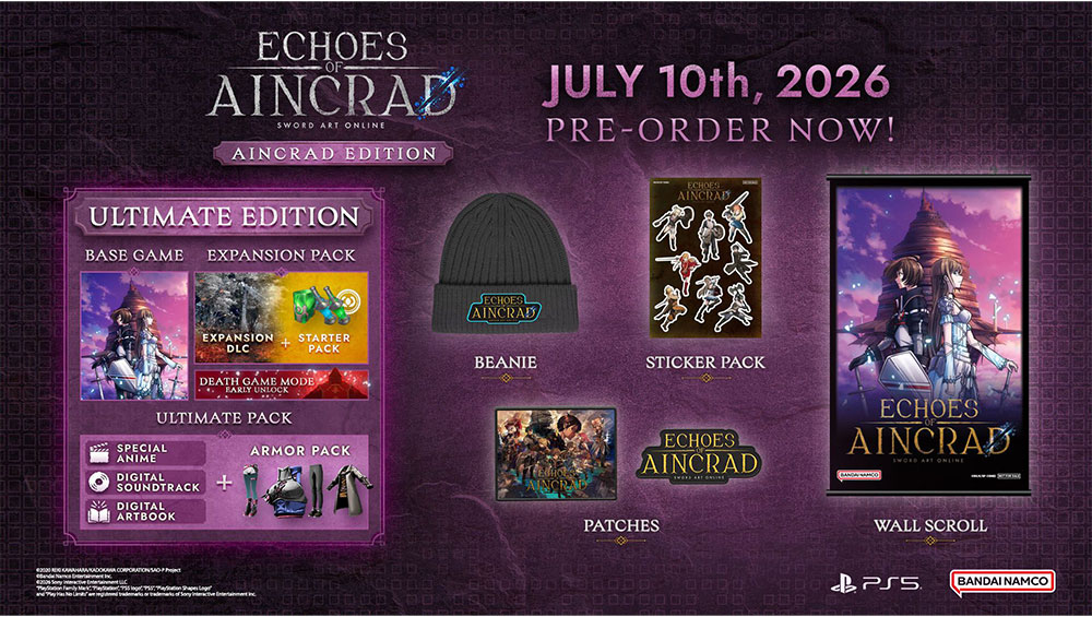 Im Juli 2026 bringt Bandai Namco das RPG „SWORD ART ONLINE: Echoes of Aincrad“ in den Standard Varianten, als Ultimate Edition und in der Aincrad Collectors Edition für die Playstation 5, Xbox Series X und den PC heraus. In Japan ist außerdem noch eine Premium Edition geplant.