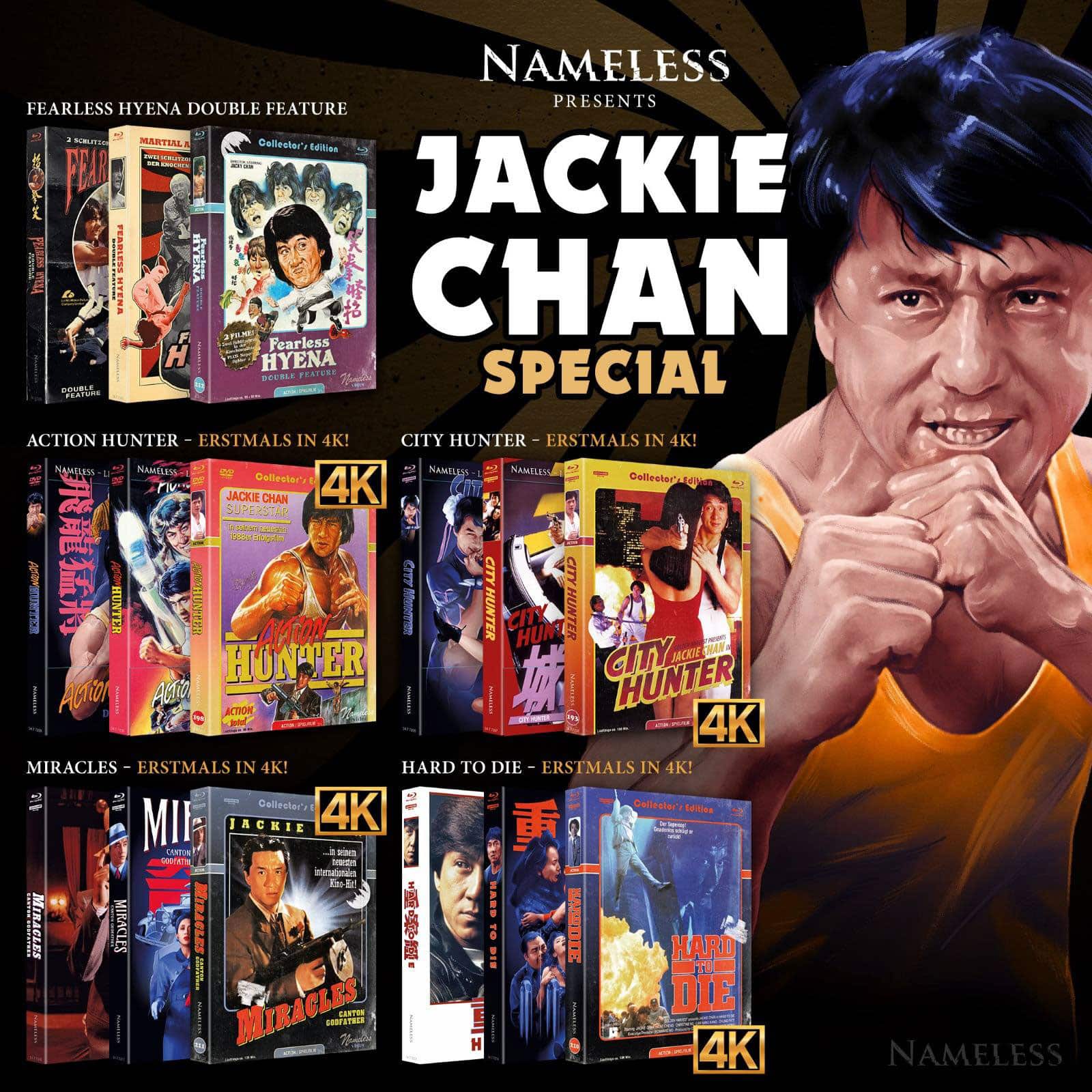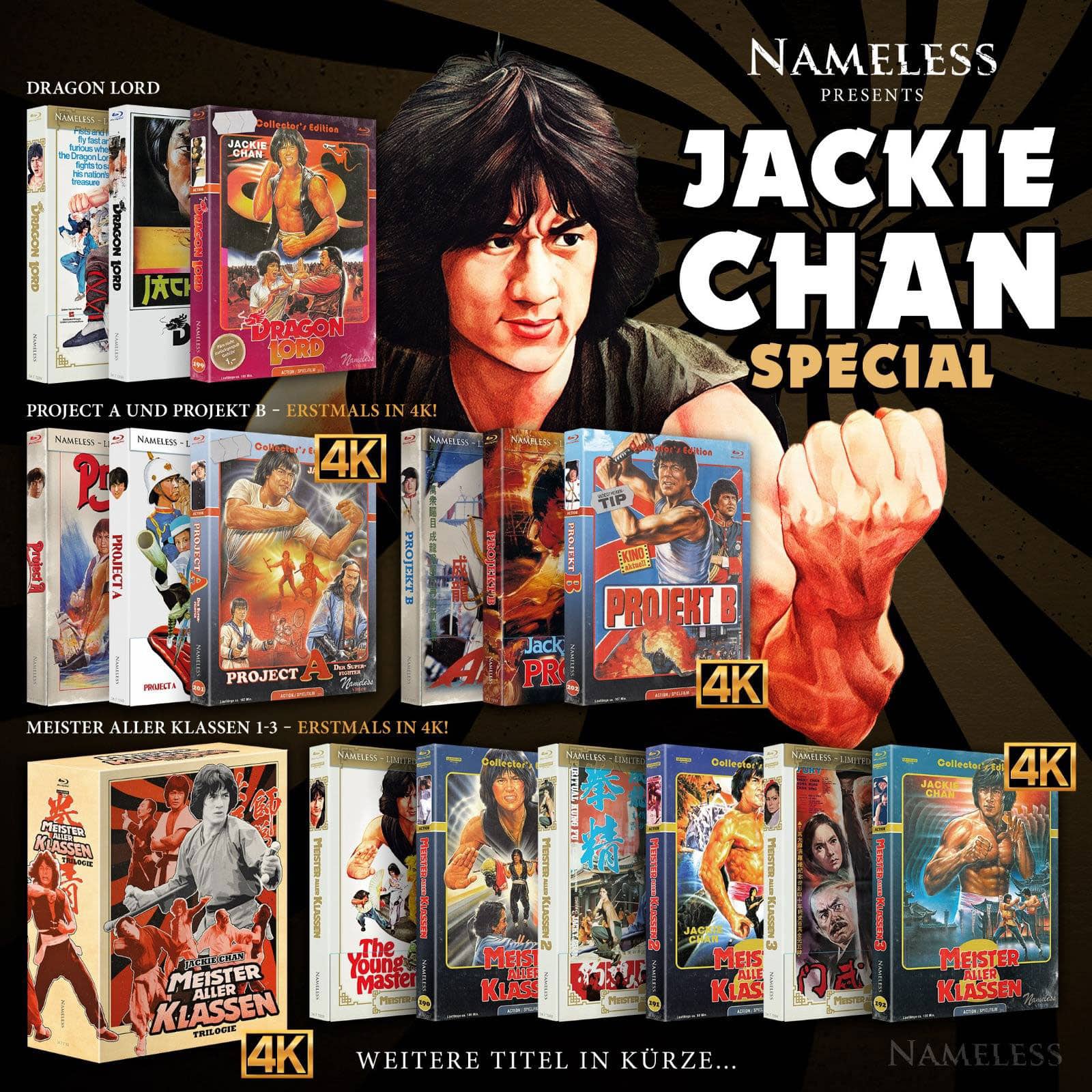 Eyk Media gibt einen Einblick bzw. eine Vorschau kommender Jackie-Chan-Titel von Nameless Media, die im vierten Quartal 2025 und in den ersten drei Quartalen 2026 erscheinen sollen. Dazu gehören Titel wie „Meister aller Klassen“, „Project A“, „Dragon Lord“, „Action Hunter“, „Der Protektor“, „City Hunter“, „Miracles, Fearless Hyena“ und „Hard to Die Crime Story“.